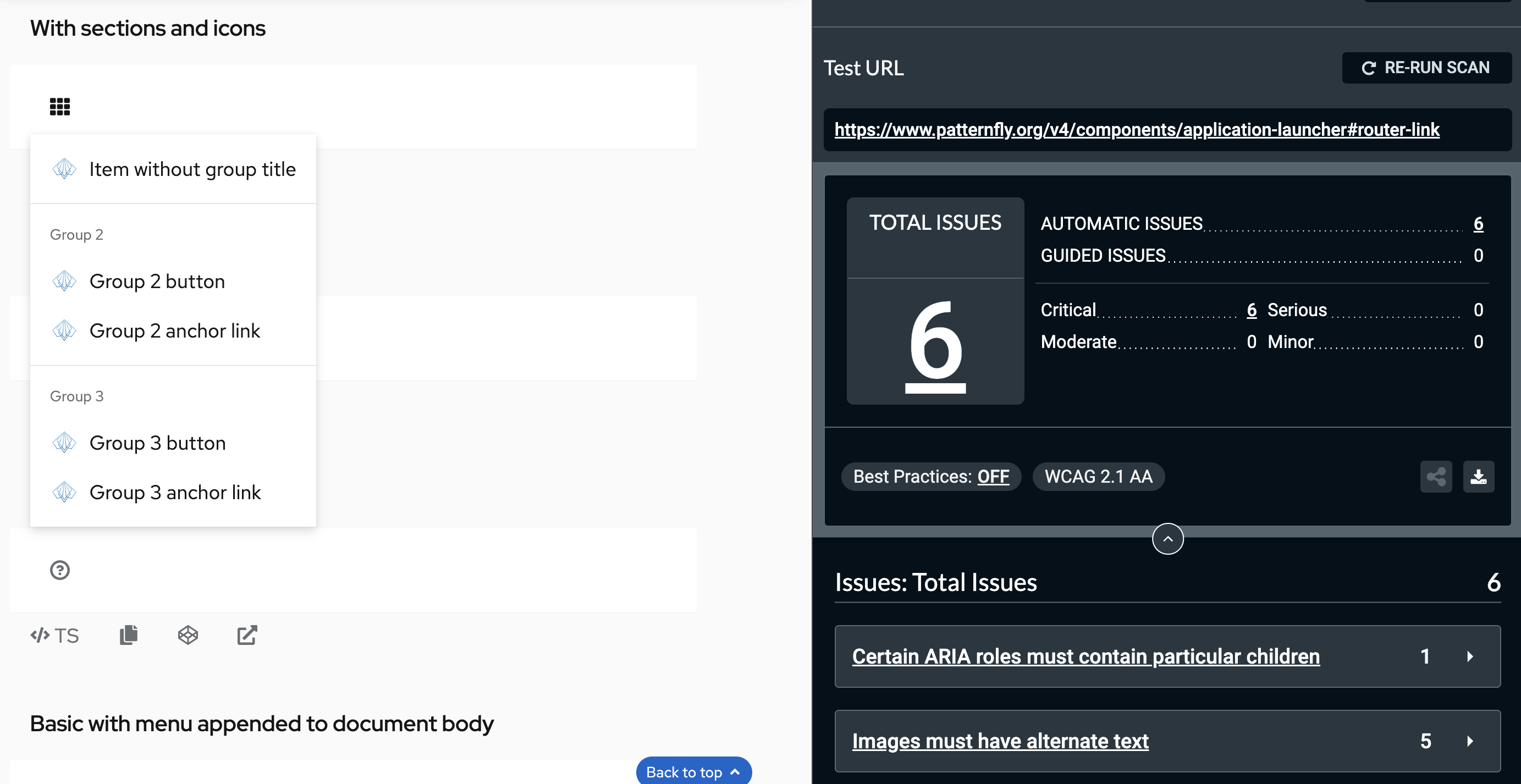 - Open the app launcher in this example: https://patternfly.org/v4/components/application-launcher#with-sections-and-icons
