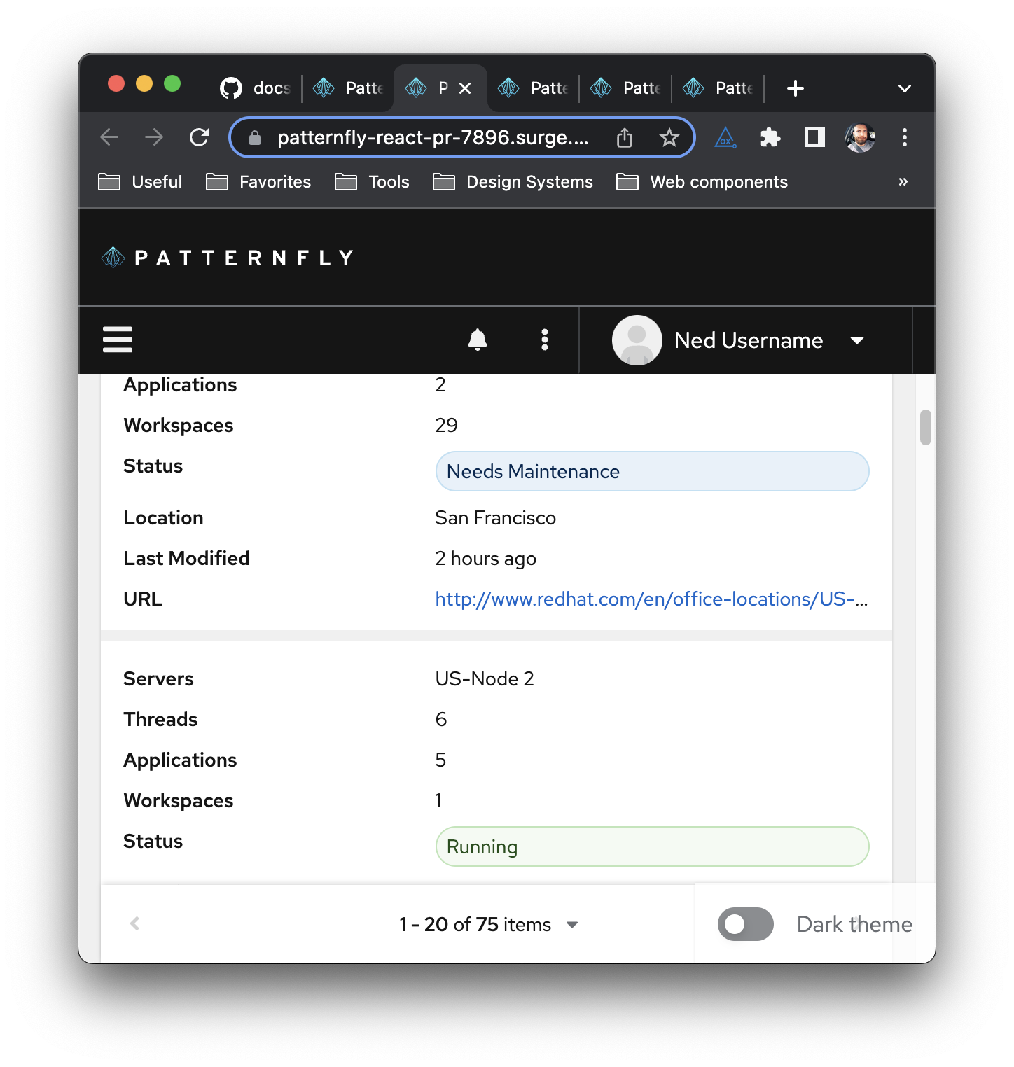 This may be out of scope but I noticed a spacing difference between core and react, and looks like it's due to a difference in the toggle between the core and react demos. We recently made an update to the plain text options menu (what's used in pagination) that makes the entire toggle clickable versus just the toggle icon. @thatblindgeye added that in #7192 as a perPageComponent="button" prop on <Pagination>, but our demos that reference <Pagination> are not using it.