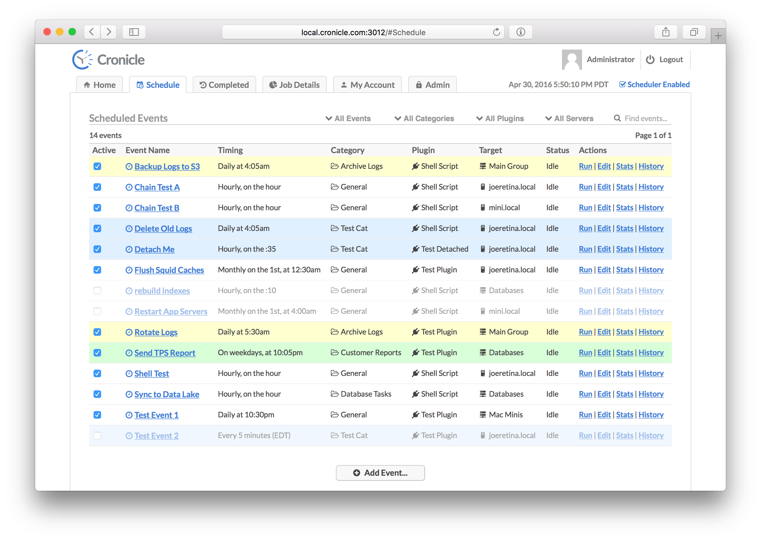 | Event | An entry in the schedule, which may run once or many times at any interval. Each event points to a Plugin, and a server or group to run it. |