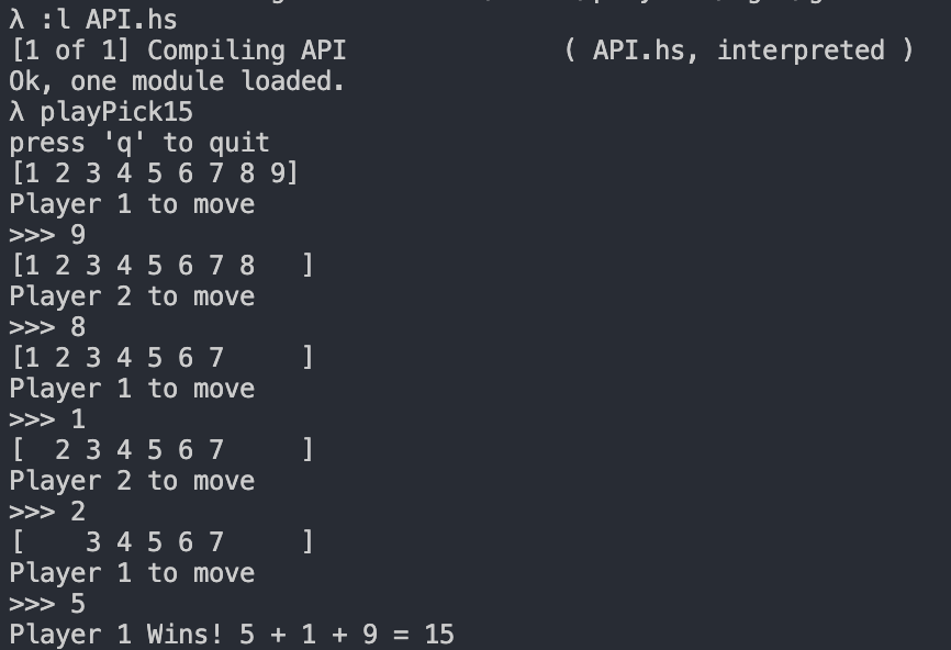 This is a Haskell implementation for the game "Number Scrabble". Players take turns picking a number from a pool of 15.