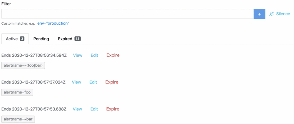 gettableSilenceMatchesFilterLabelsin api/v2 checks whether a silence matches a given filter, especially for regex cases. In short,For instance, as shown in figure #2283, a silence