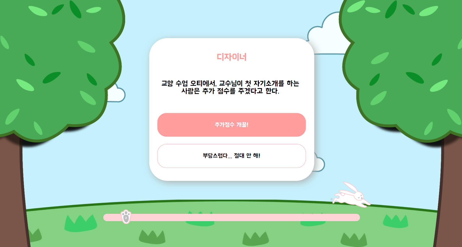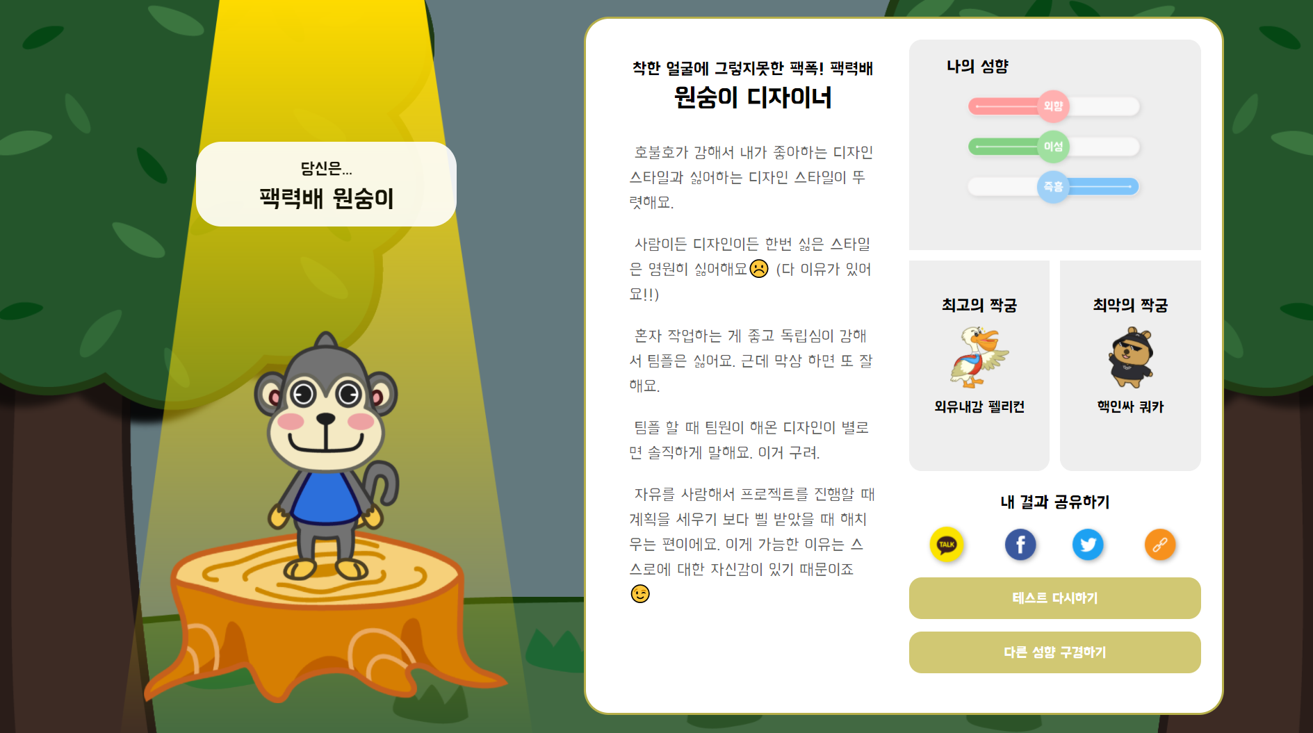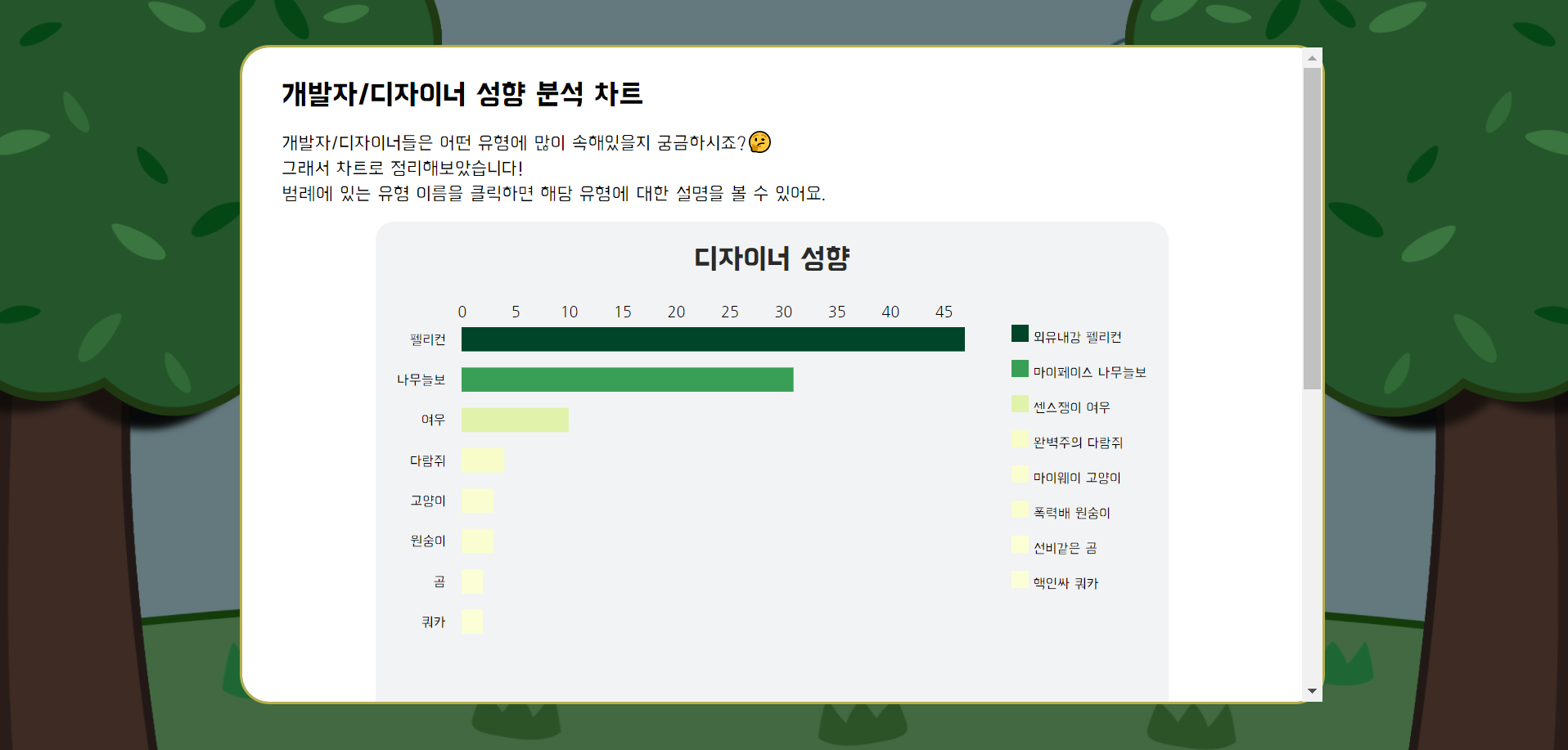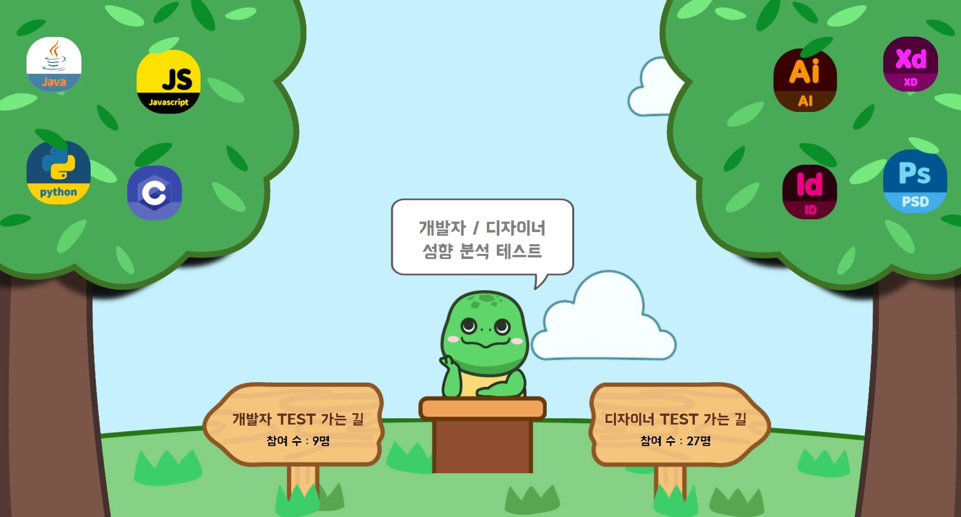Deveolper Designer Type Indicator 나는 어떤 유형의 개발자/디자이너일까요? 개발자/디자이너들은 주로 어떤 유형에 속해있을까요? DDTI는 개발자/디자이너 성향 테스트를 통해 사용자의 성향을 분석하고, 각 유형에 해당하는 사용자 수를 수집하여 차트로 시각화합니다. 📝 테스트 해보기 📚 Project Stack React Firebase (Realtime Database) Styled Components D3.js 😎 Gallery