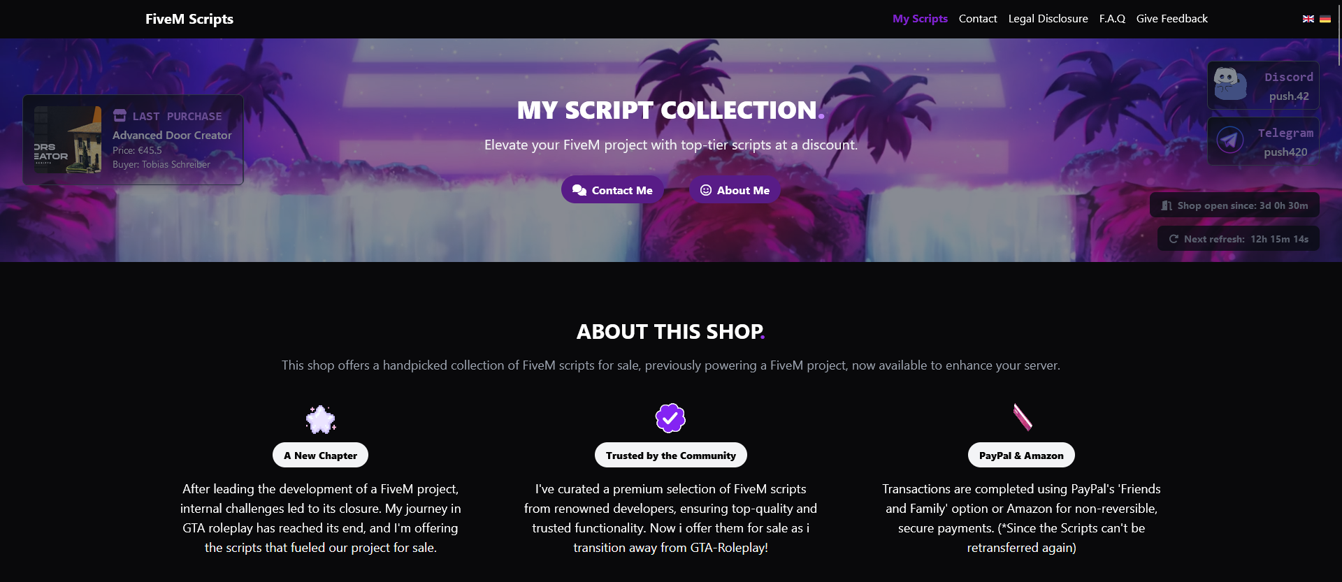 I personally lost interest in developing and maintaing a FiveM Server. Because of this reason i setup a personal portfolio with all of my collected scripts over the past years. This way people can easily see what kind of scripts i offer and directly contact me trough my website or via social profiles. Feel free to customize this website to your liking and use it for whatever you please! Happy Coding! <3