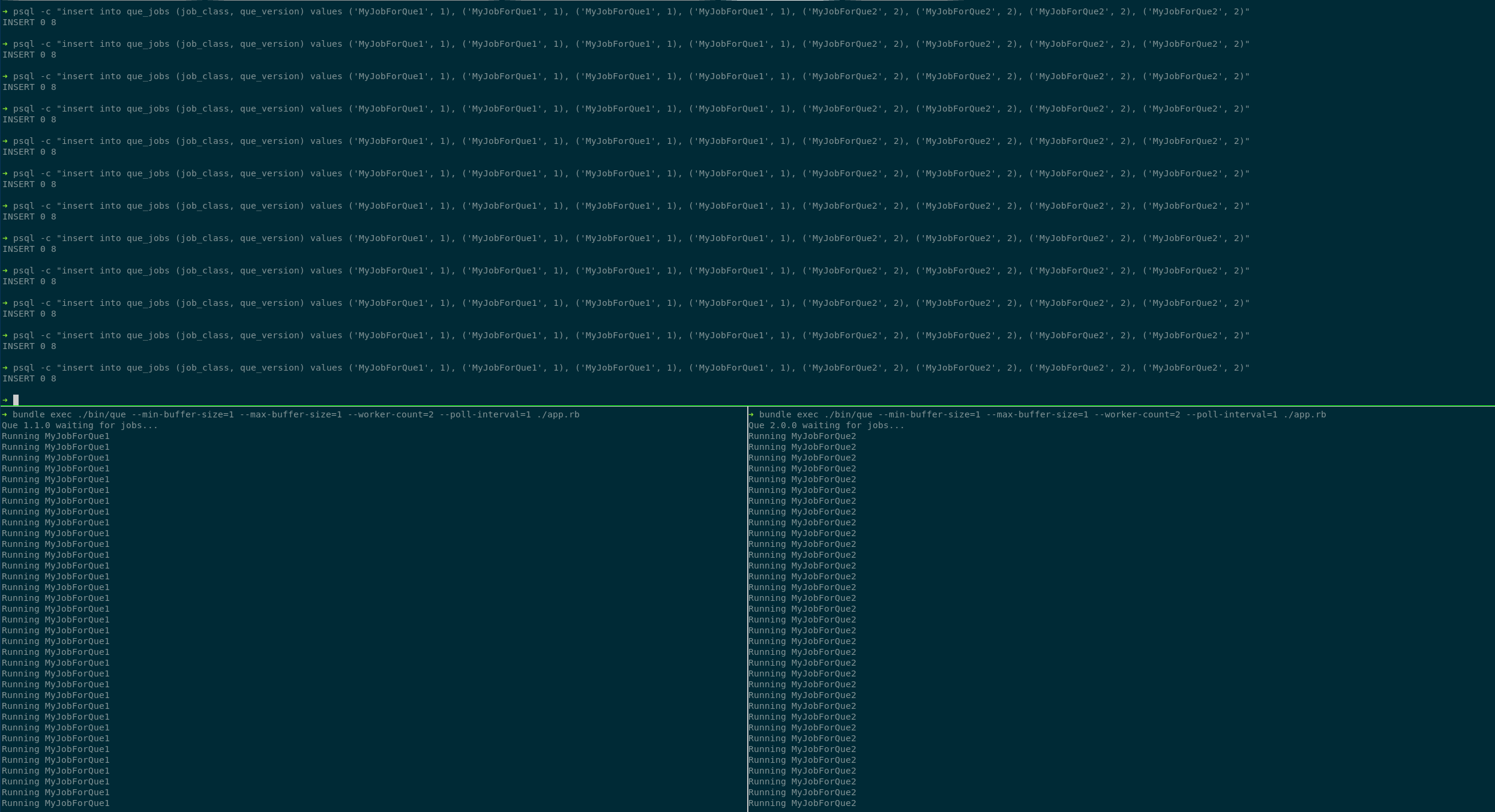 psql -c "insert into que_jobs (job_class, que_version) values ('MyJobForQue1', 1), ('MyJobForQue1', 1), ('MyJobForQue1', 1), ('MyJobForQue1', 1), ('MyJobForQue2', 2), ('MyJobForQue2', 2), ('MyJobForQue2', 2), ('MyJobForQue2', 2)"