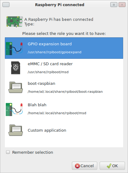 Don't think searching the home directory for custom images is a good idea. If I was an unprivileged user on a multi-user setup, and wanted to view the contents of a file I am not supposed to have access to, all I would need to do is something along the lines of: Plug in a Pi zero, and your code will show the contents of the file I symlinked While that could be made harder by testing if the file is a regular file and not a link -instead of just that it exists like you do now-, also keep in mind that While I can understand the desire to have the option to dynamically add extra items to the menu, I think it would make things simpler if discovery was limited to == Might want to consider using And leaves the option open of adding extra parameters in the future, if there is any need for that. Can be parsed with the standard g_key_file_* glib functions, which we currently already use to parse the settings file that stores always use image. https://specifications.freedesktop.org/desktop-entry-spec/desktop-entry-spec-1.1.html In that case I would suggest also creating those files for the standard images like gpioexpander, instead of having them hard coded like you currently have. == Not sure if showing the full path in the GUI isn't too much detailed information for the average user. |