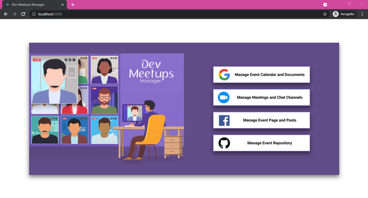 The Dev-Meetups-Manager makes it easier to manage meetups. When organizing a meetup, this allows you to create google calendar event, upload files to the google drive, create and delete zoom meetings and zoom chat channels, upload facebook posts, create github repositories. After you can share created meeting resource among the members attending the meetup. With the help of the Dev-Meetups-Manager application, event organizers can easily manage event calendar, online meetings, GitHub repositories for their events, and performing facebook social media campaigns for their events. The Dev Meetups Manager application uses the OAuth 2.0 authentication framework to gain access to Google, Zoom, Facebook and GitHub resources through the API.