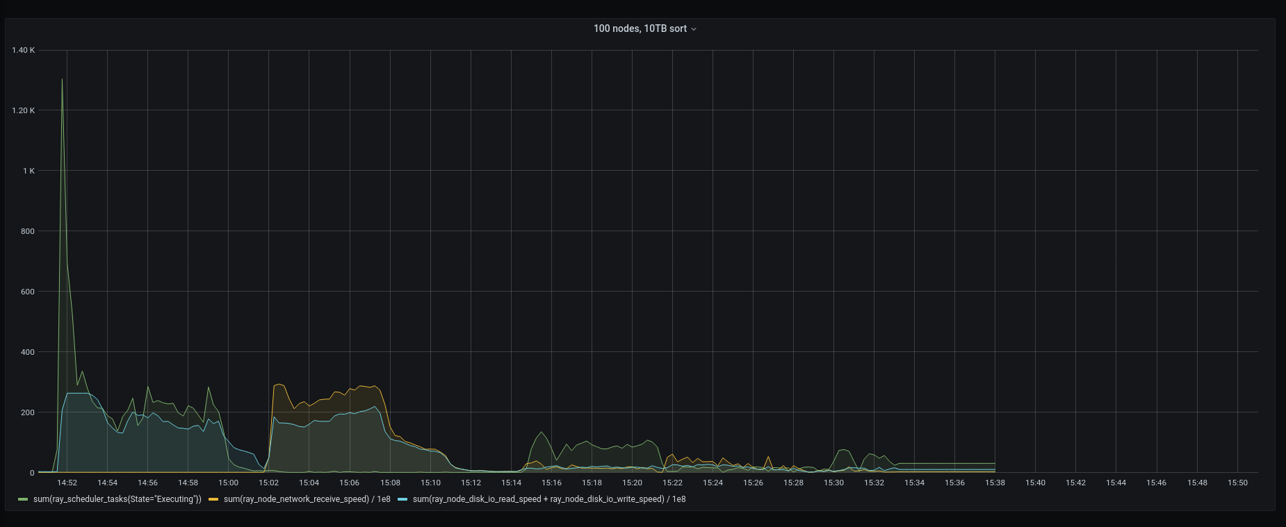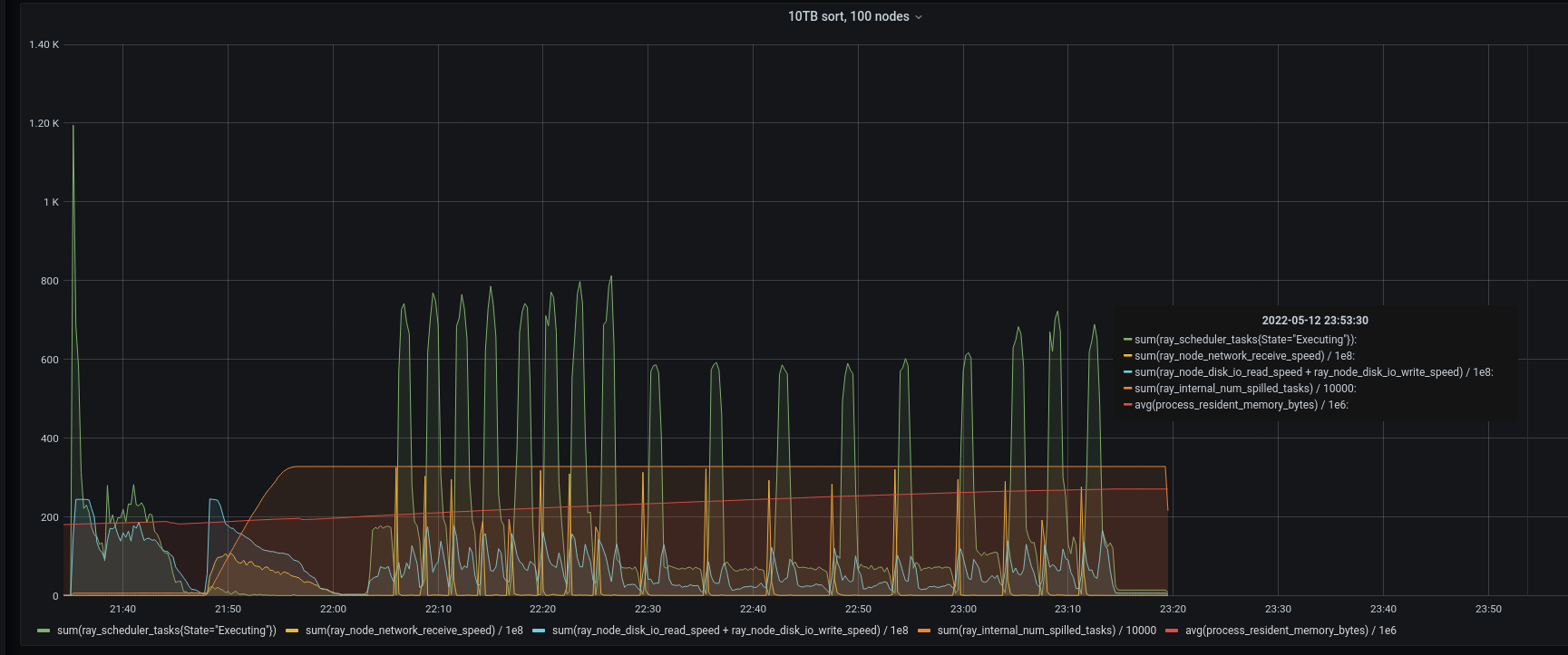 Still seeing unexpected transfers when there is heavy task load, but this does seem to have fixed the problem in 10TB sort where the head node raylet was coming under heavy load. Note task throughput (green lline) is very low towards the righthand side of the graph in the before version. |