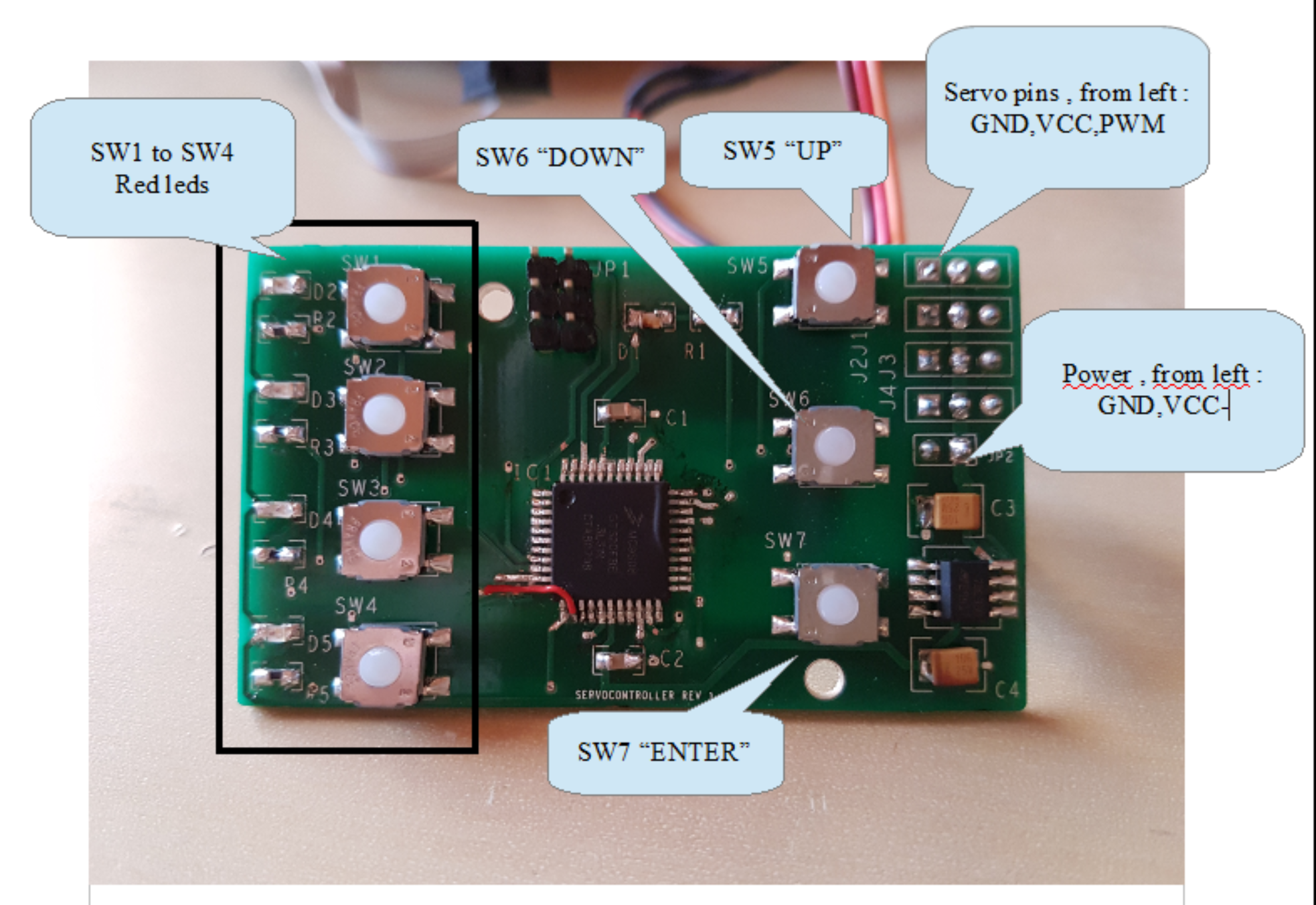 You have other 3 push button, SW5 (UP) SW6 (down) SW7 (ENTER), to enter in programming mode press for 3" the SW7. When in programming mode all red leds will blink quickly, now press one pushbutton from SW1 to SW4 to select the channel servo you want calibrate / programming, corresponding led will be off or on (depend how many time you press the button), each time corresponding led toggle and servo follow the programmed values, press SW5 UP or SW6 DOWN to adjust the servo position you like, make it for MIN position (led off) and MAX position (led on), repeat it as you like until the two servo positions are right for your requirements.