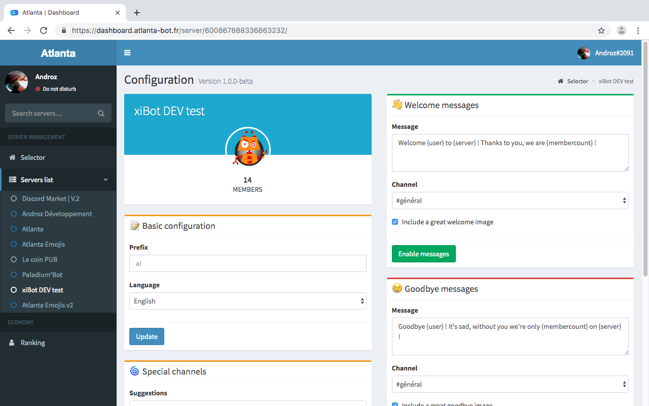 Atlanta is a open source Discord bot coded in JavaScript with Discord.js and Mongoose by Androz2091.