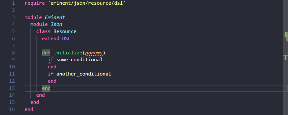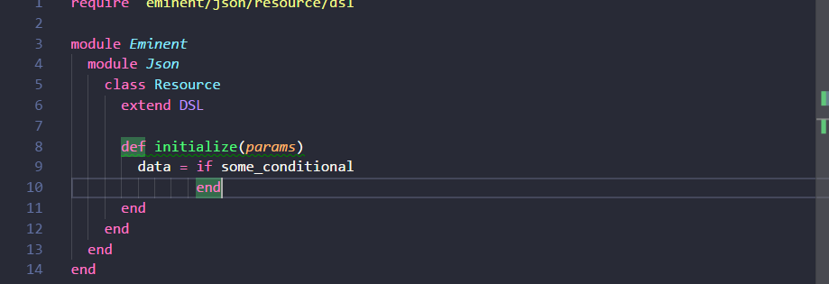 all def's if's, do's, and class/module align correctly underneath the appropriate nested method or module