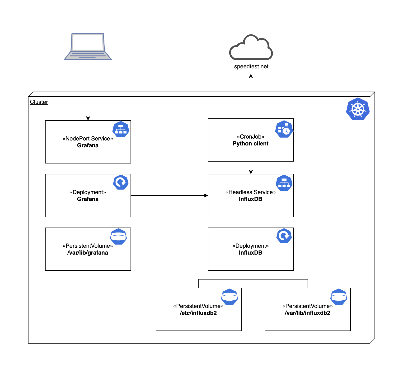 NodePortassigned to the Grafana service (by default in the 30000-32767 range).# On your Pi kubectl -n $NAMESPACE get svc $RELEASE-grafana-svc NAME TYPE CLUSTER-IP EXTERNAL-IP PORT(S) AGE speedtest-grafana-svc NodePort 10.152.182.171 <none> 3000:32425/TCP 52s