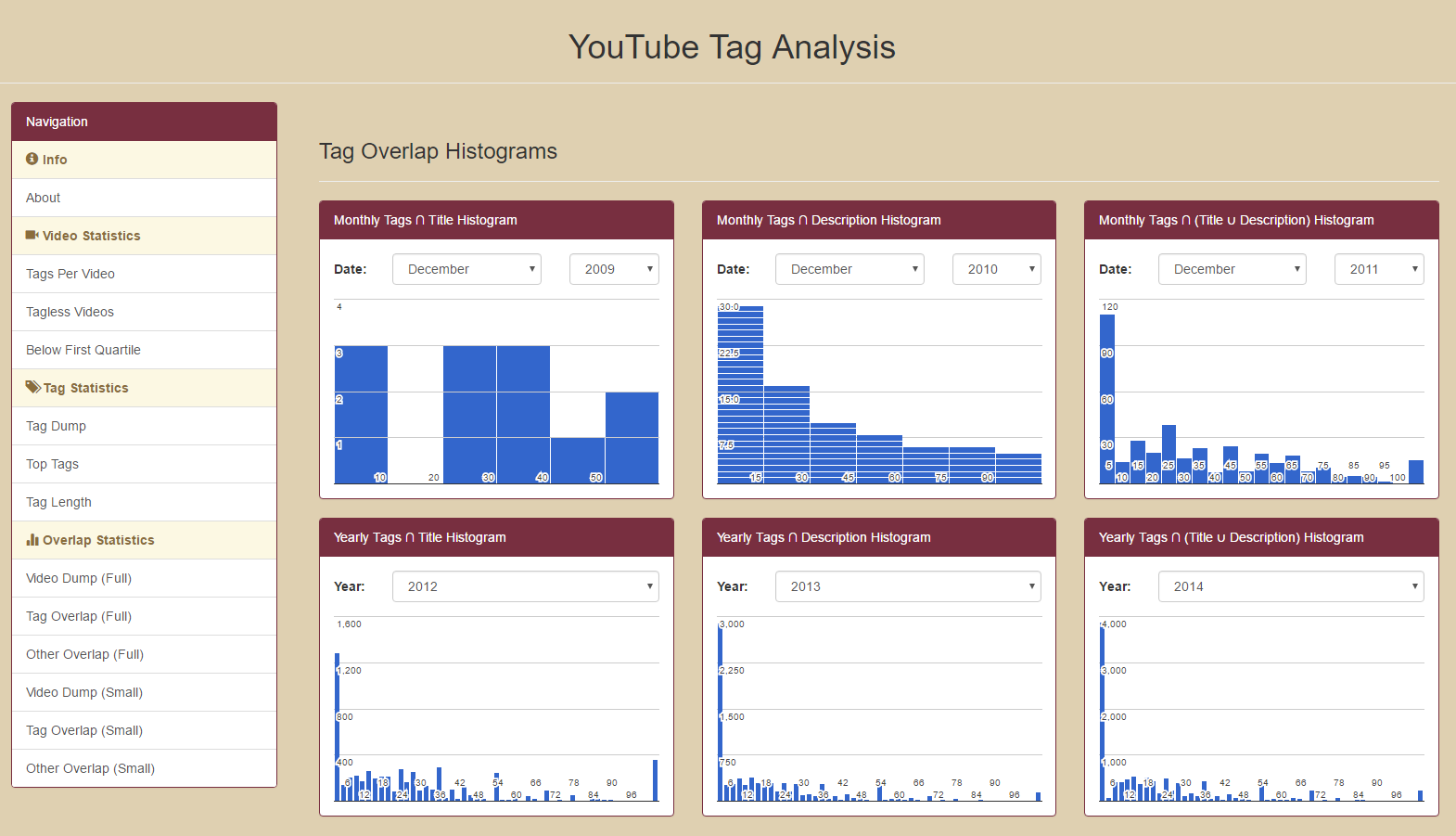 YouTube is one of the most popular websites for sharing videos, containing 60% of videos watched online. They use the tags assigned to a video as a means to improve content discovery and browsing of related content in a large collection of videos. We want to collect information regarding the textual properties of tags and their relationship with other metadata elements such as the title, description, and transcript.