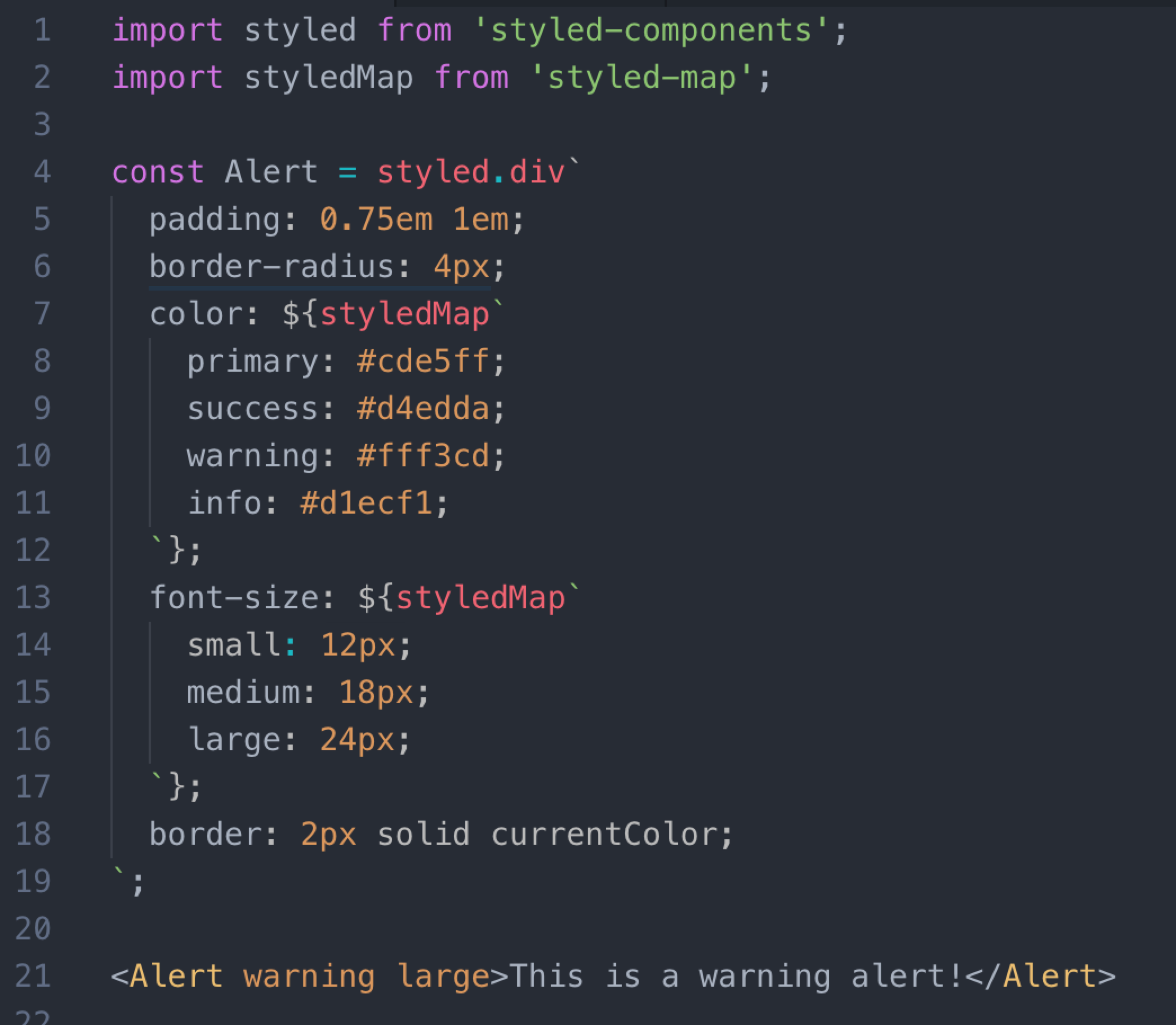 <Button primary large>Submit</Button>Here's the same component using styled-map: