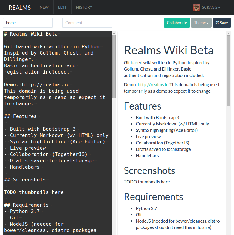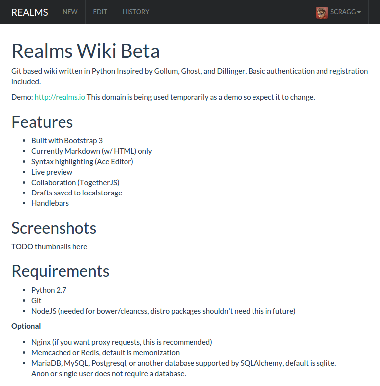 Git based wiki written in Python Inspired by Gollum, Ghost, and Dillinger. Basic authentication and registration included.