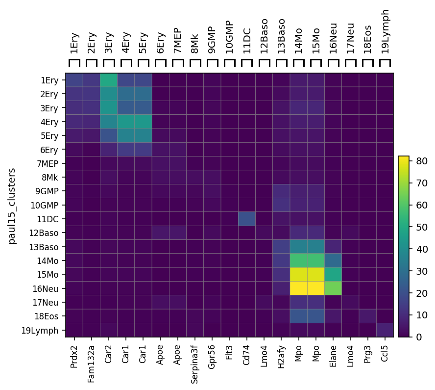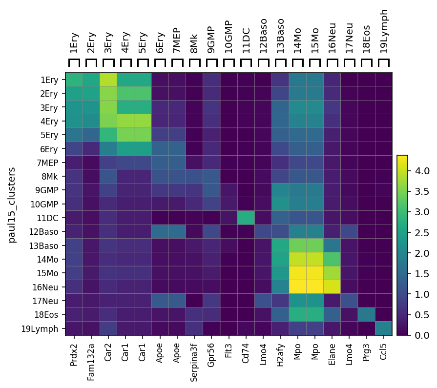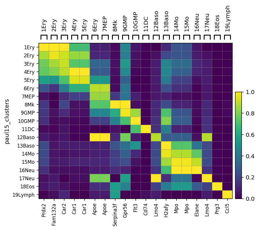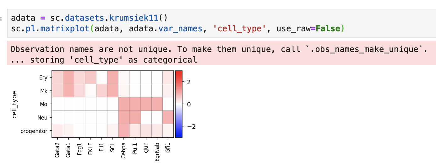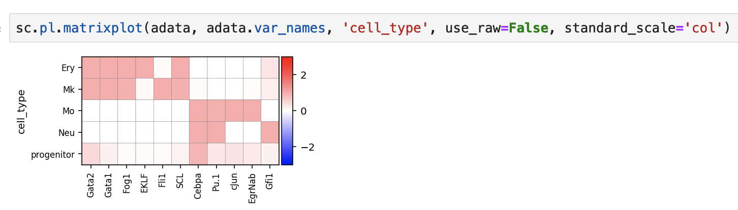 Default values of vmin/vmax looks ok for most datasets, but when we squash everything between 0 and 1, the negative scale doesn't make sense any more. Furthermore, even for max values (i.e. 1.0) colors will look dimmer than the color representing the max value. For example: sc.pl.rank_genes_groups_matrixplot(adata, n_genes=1, standard_scale='var', use_raw=False)generates Color scale might be a bit confusing for some, IMHO. I think it makes more sense to switch back to default sequential colormap if We can merge this and play around with different datasets etc, too. |