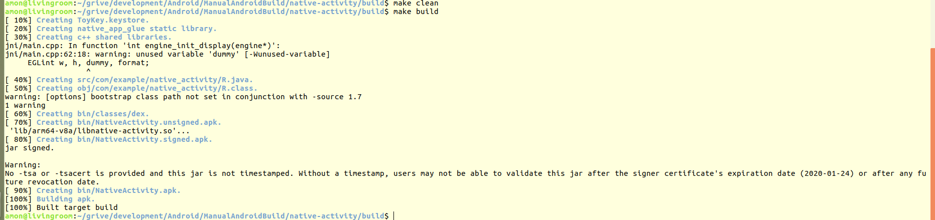 Note that in the CMakeLists.txt file you have to update the paths with your individual paths. That means, you have to download a bunch of software, place them in a folder and set up the native standalone toolchain from the android ndk.