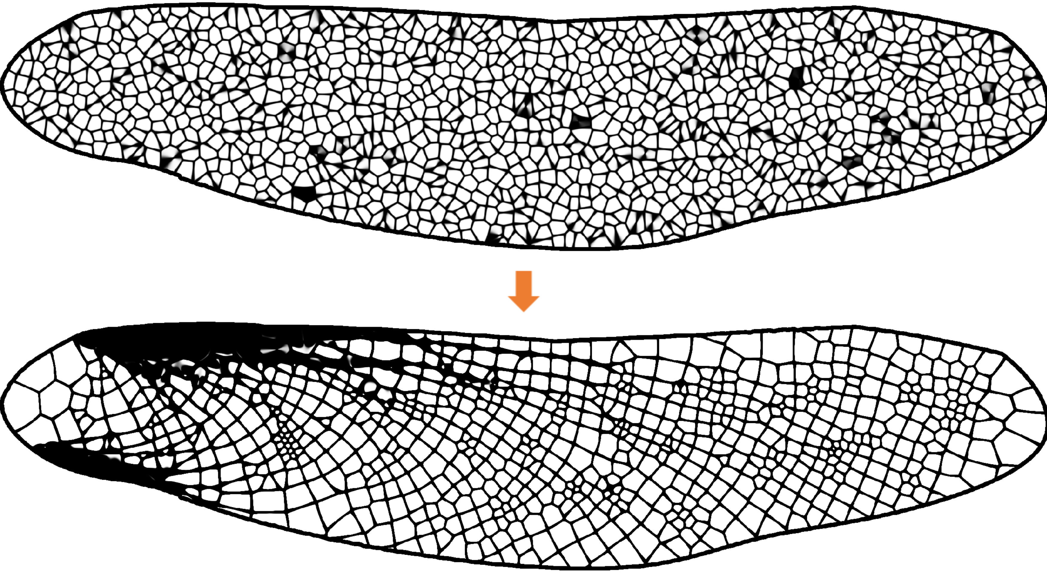 The evolution result of the odonata front wing.Cellular structures manifest their outstanding mechanical properties in many biological systems. One key challenge for designing and optimizing these geometrically complicated structures lies in devising an effective geometric representation to characterize the system’s spatially varying cellular evolution driven by objective sensitivities. A conventional discrete cellular structure, e.g., a Voronoi diagram, whose representation relies on discrete Voronoi cells and faces, lacks its differentiability to facilitate large-scale, gradient-based topology optimizations. We propose a topology optimization algorithm based on a differentiable and generalized Voronoi representation that can evolve the cellular structure as a continuous field. The central piece of our method is a hybrid particle-grid representation to encode the previously discrete Voronoi diagram into a continuous density field defined in a Euclidean space. Based on this differentiable representation, we further extend it to tackle anisotropic cells, free boundaries, and functionally-graded cellular structures. Our differentiable Voronoi diagram enables the integration of an effective cellular representation into the state-of-the-art topology optimization pipelines, which defines a novel design space for cellular structures to explore design options effectively that were impractical for previous approaches. We showcase the efficacy of our approach by optimizing cellular structures with up to thousands of anisotropic cells, including femur bone and Odonata wing.