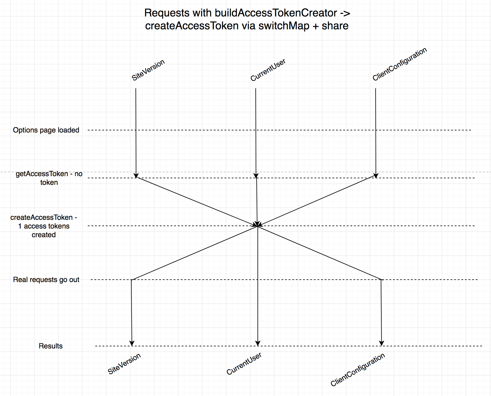 What buildAccessTokenCreator does is create a single source observable that each concurrent request can use to get a single access token from. Below is a diagram of how it looks with concurrent requests.
