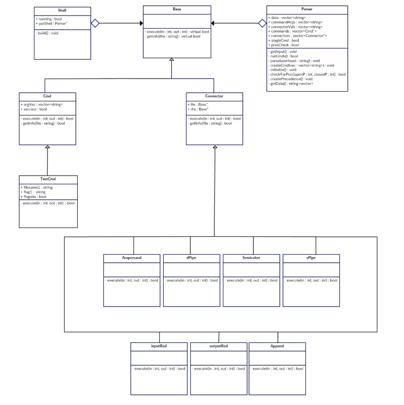 In order to implement this overview, we plan to use the composite pattern design. Starting with a base class called Base, we will run the shell through the different composite classes and leaf classes which interconnect and communicate with each other. We also have two aggregate classes called Shell and Parser which build the program and parse the user input respectively.