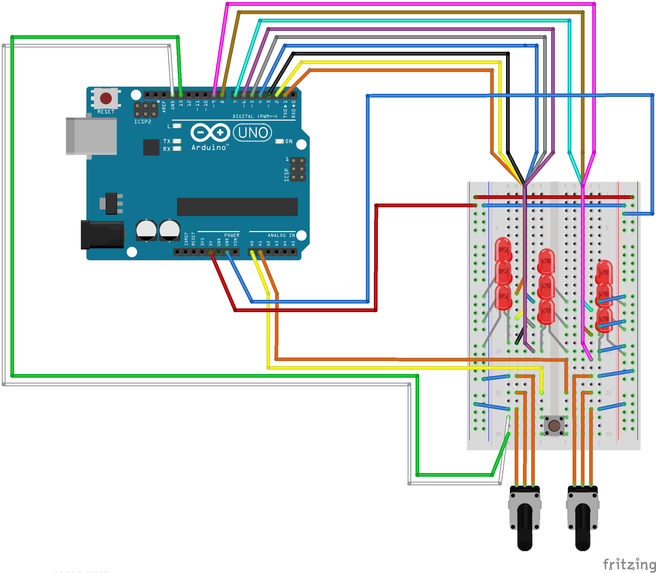 NOTE: I used two potentiometers as controllers because 4 push buttons (Up/Down, Left/Right) are just too boring, and I couldn't get my hands on a joystick. This ended up being rather cool, since it adds to the general feeling of 'defusing' mines. Inspiration by: Etch-A-Sketch <3.