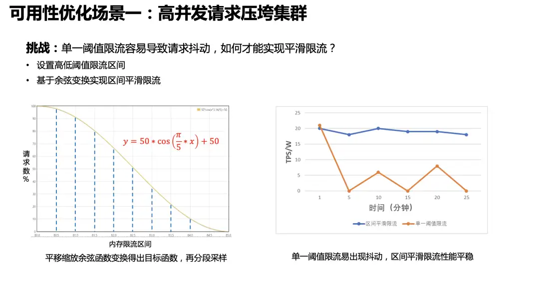 限流方案里面有一个挑战是:我们如何才能实现平滑限流?因为采用单一的阈值限流很容易出现请求抖动,例如请求一上来把内存打上去马上触发限流,而放开一点点请求又会涌进来把内存打上去。我们的方案是设置了高低限流阈值区间,在这个区间中,基于余弦变换实现请求数和内存资源之间的平滑限流。当内存资源足够的时候,请求通过率 100%,当内存到达限流区间逐步上升的时候,请求通过率随之逐步下降。而当内存使用量下降的时候,请求通过率也会逐步上升,不会一把放开。通过实际测试,平滑的区间限流能在高压力下保持稳定的写入性能。