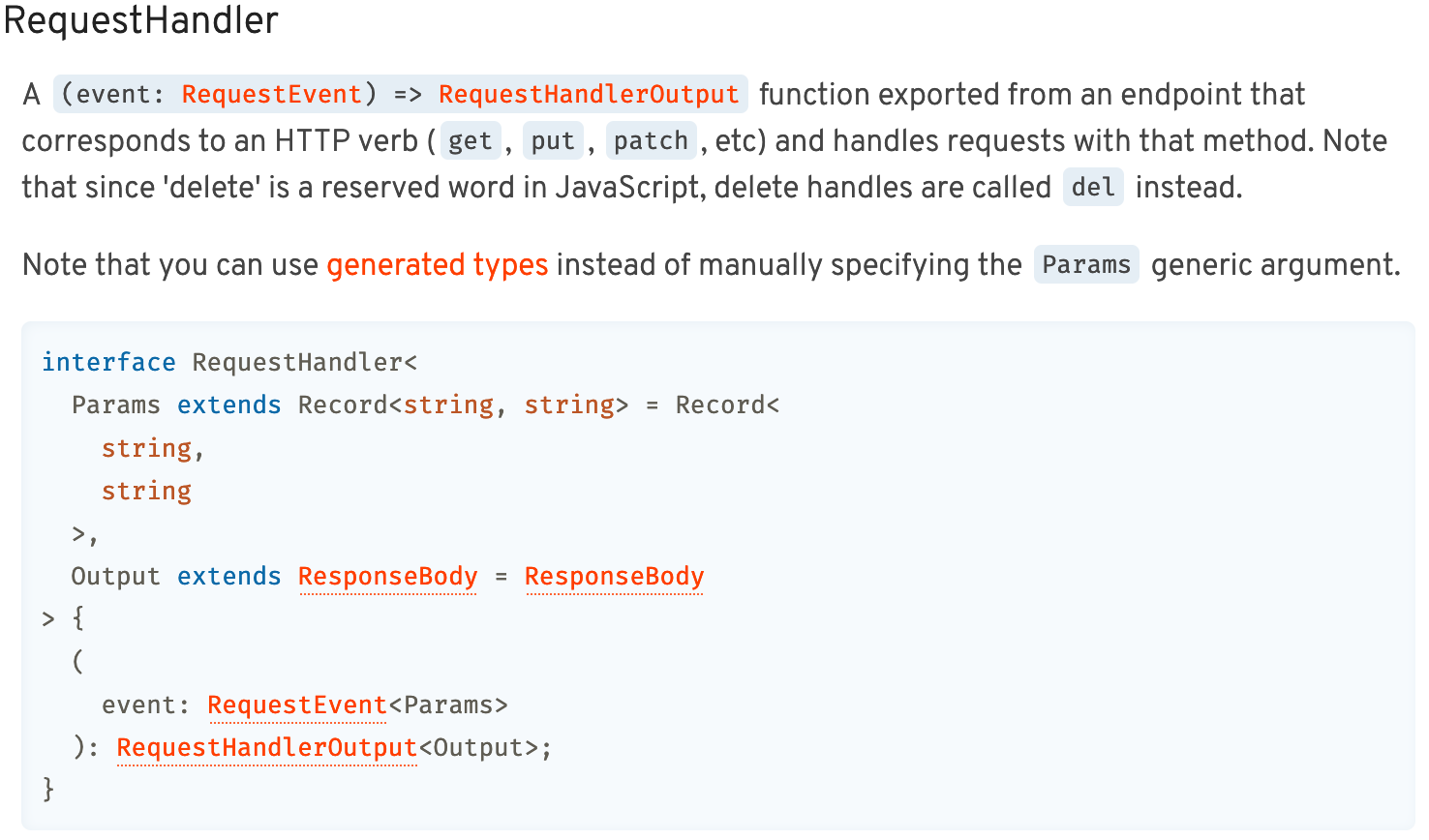 | * A `(event: RequestEvent) => RequestHandlerOutput` function exported from an endpoint that corresponds to an HTTP verb (`get`, `put`, `patch`, etc) and handles requests with that method. Note that since 'delete' is a reserved word in JavaScript, delete handles are called `del` instead. |