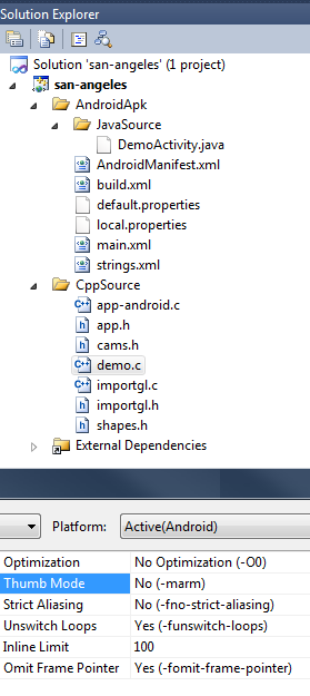 - Intellisense and 'External Dependencies' correctly pull in Android NDK headers.