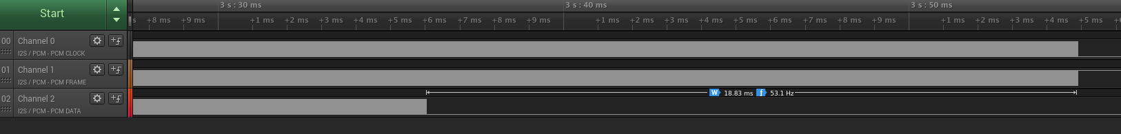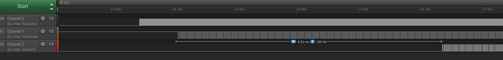 @bardliao I can confirm that the nocodec M4 stuff does not work with the MCLK | BCLK case. Using BCLK_ES only gives me the right config with BIT(7) set. That said, when I add you kernel patch to add a 1s delay on startup, I see it but on bclk only. Somehow the FSYNC starts with the data, that's not aligned with what the documentation says. Can you confirm if you've seen the FSYNC also toggle earlier than the data and start at the same time as BCLK? |