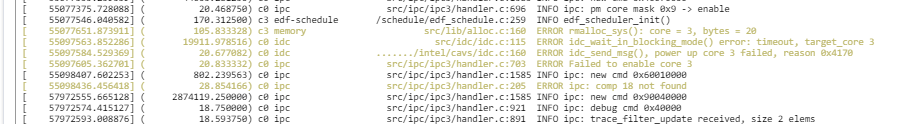 @rfredzim something odd is indeed going on. One thing I noticed is that the IDC payload data is an array of structures per core that are not cache aligned. diff --git a/src/include/sof/drivers/idc.h b/src/include/sof/drivers/idc.h
