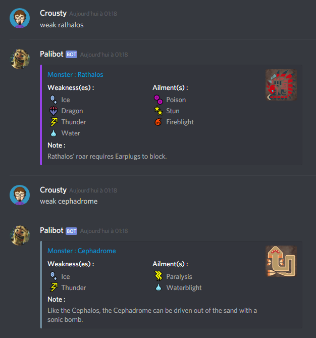 and type 'info monster' (like 'info rathian' or 'info yian' (to display info about yian kut-ku) or 'info gore magala') in chat to get a monster specific weakness(es), ailment(s) and a random fact about the monster ! You can also type 'pali help' in order to show help if you are unsure on how to use the bot.