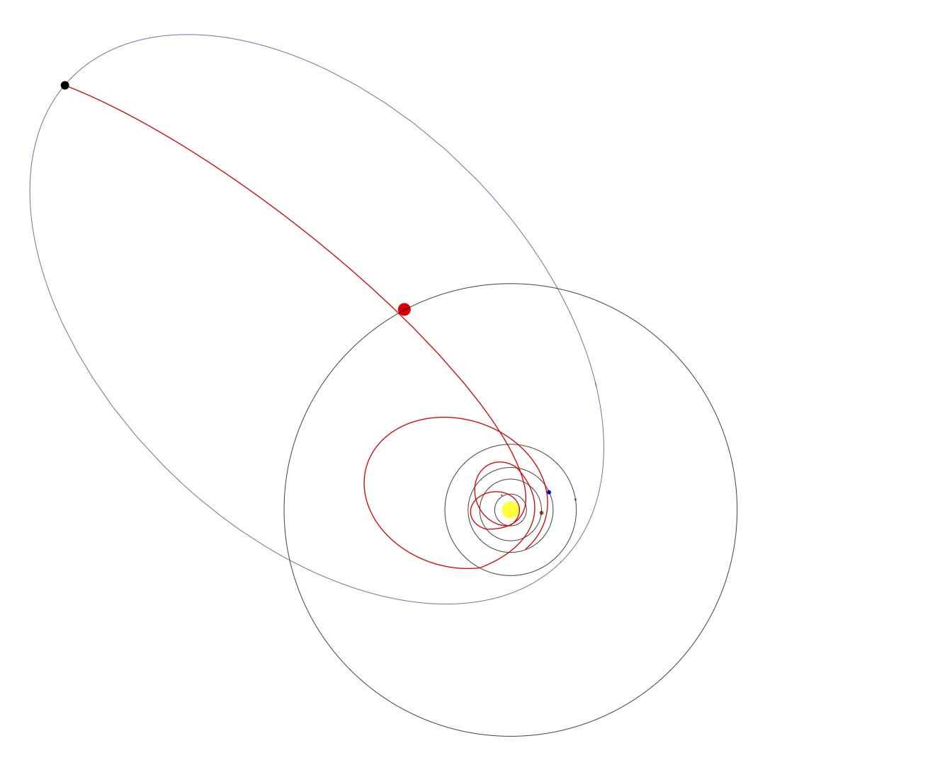 Sample screenshot. Mouse controls allow for full 3D panning, arrow keys allow for speed control. The enter key can be pushed at any time to restart the current trajectory. The application must be restarted to return to the opening screen.