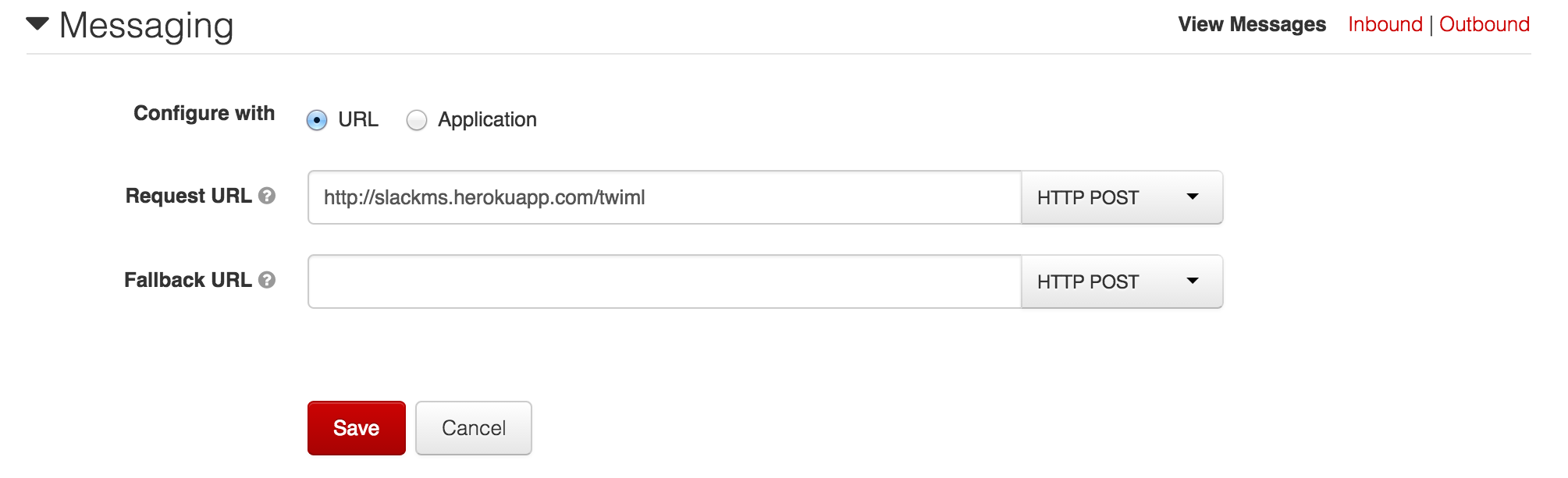 Update the Messaging Request URL to your URL with route