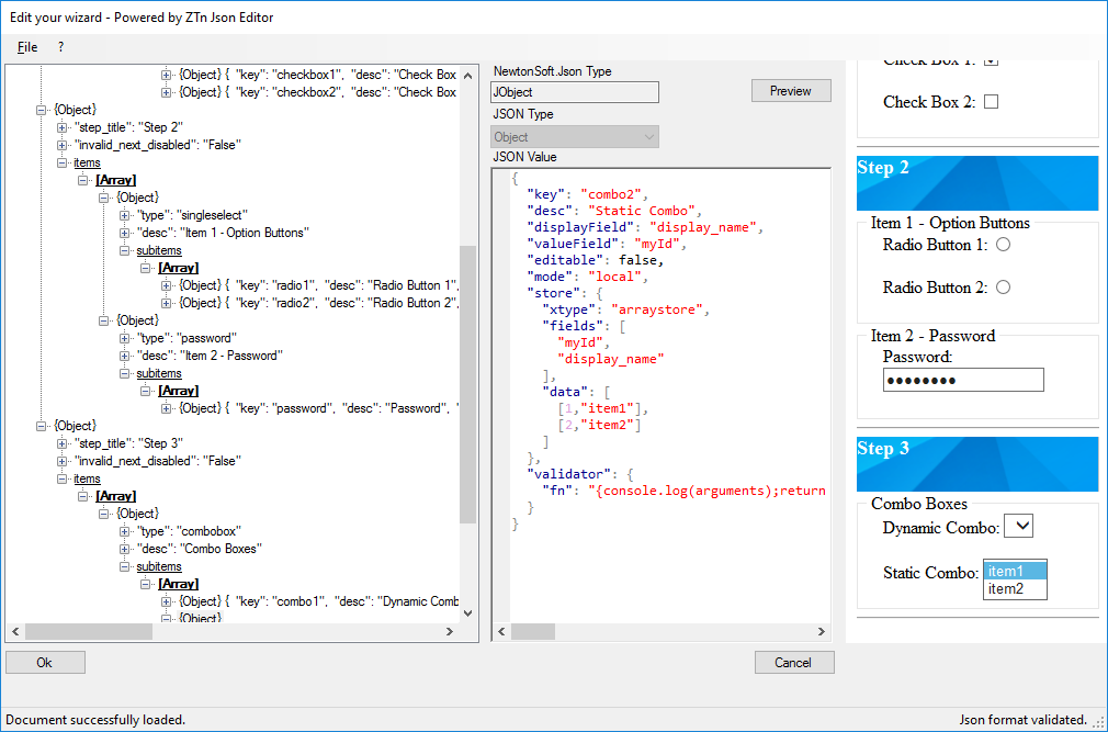 Next, using an Editor based on ZeToken’s Json Editor, you can edit those Wizards. Context menus will guide you in adding Steps in your wizards and Items in those Steps (like Text Boxes, Combo Boxes, Radio Buttons, Check Boxes, Password Boxes).