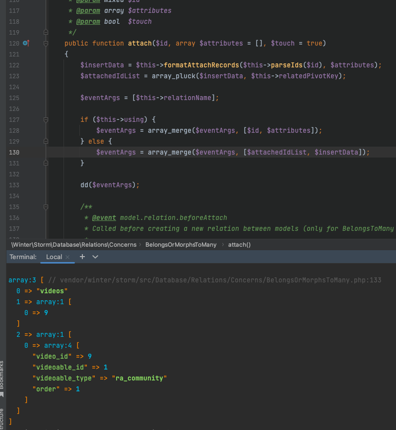 I just wanted to report after pulling in the latest commit from winter/storm the following code no longer works for me: $model->bindEvent('model.relation.afterAttach', function (string $relationName, array $attachedIDList, array $insertData) use ($model) {