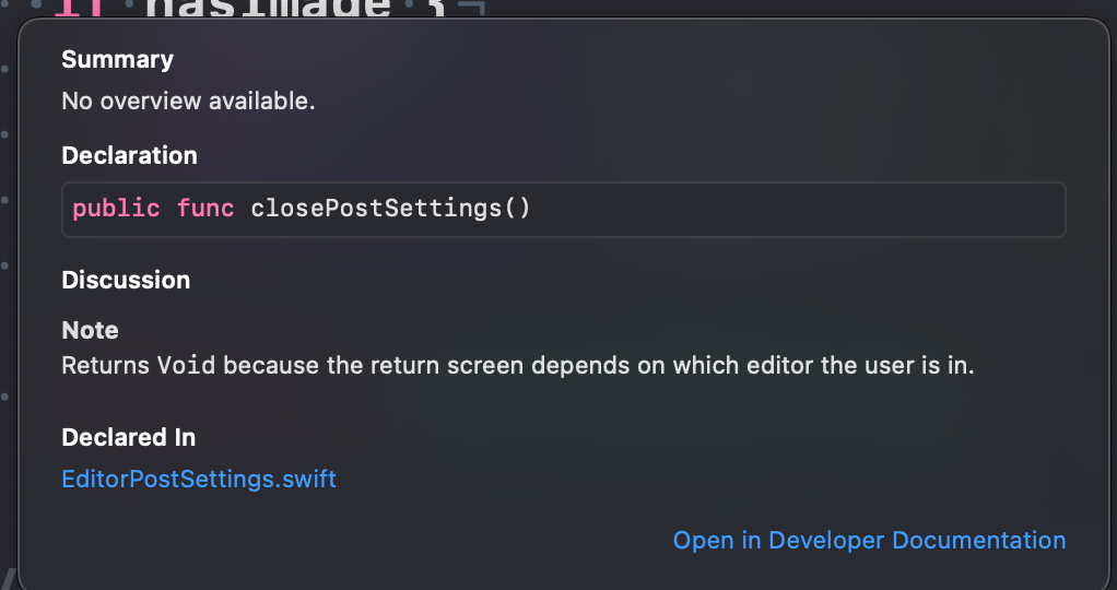 | /// - Note: Returns `Void` because the return screen depends on which editor the user is in. | ||