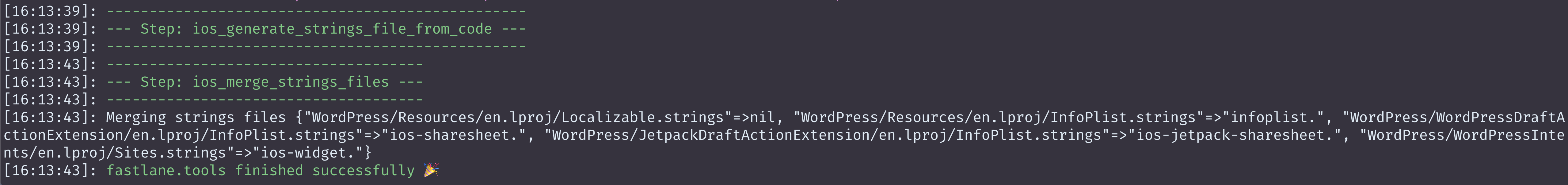 Localizable.strings, but it will be tricky to spot them in between all the new strings. A way to verify this would be:trunkbundle exec fastlane generate_strings_file_for_glotpressbundle exec fastlane generate_strings_file_for_glotpress skip_commit:trueagainHowever, our automation is tried and tested and I didn't feel the need to got to such length to verify it.