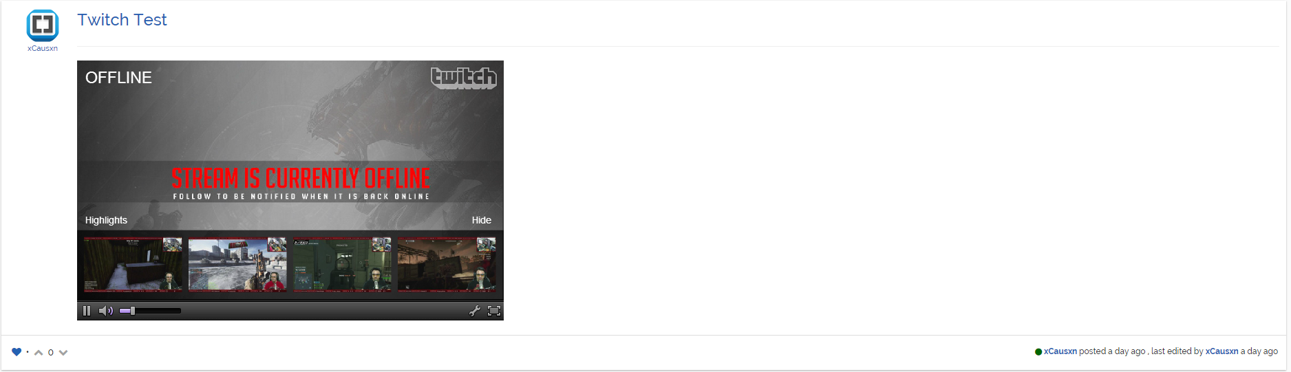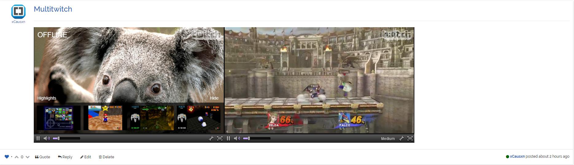 NodeBB Twitch Plugin This NodeBB plugin allows users to embed Twitch Streams and Multi Twitch Streams inline in their posts. Installation npm install nodebb-plugin-twitch Usage http://www.twitch.tv/CHANNEL http://multitwitch.tv/CHANNEL/CHANNEL Screenshots Twitch Single Multi Twitch
