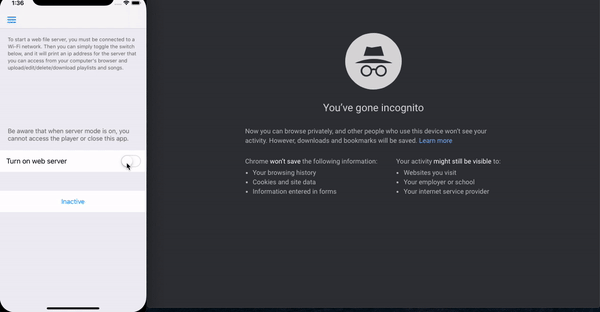 Supported Features Start web file server over Wi-Fi Upload music through iTunes "File Sharing" (no sync required!) Download music from a remote server https://github.com/yeralin/OpenPlayer-Server