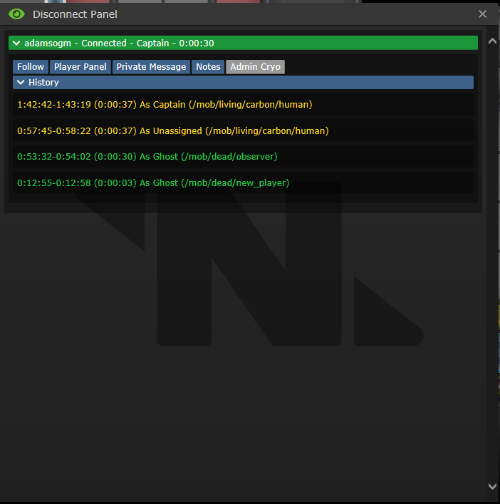 Adds a 'Disconnect Panel' which lists all players who have at some point disconnected, giving information about their connection history. This can be used to find players who have been disconnected for an extended period of time, and deal with them.