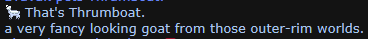 @cuackles made a sprite for a Thrumbo so I made the code. It's another goat skin that deals a bit more damage (10-15 damage per swing instead of 1-2 :^) ). The odds of seeing this around are low but never 0. This won't spawn in the kitchen because it would MOST LIKELY murder the chef on first encounter