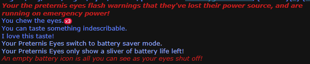 So right now Preternis eyes are hardcoded to delete themselves if they exist in any non-preternis host. While this is an incredibly rare event, it's bound to happen because of the nature of this game. so to remedy this, I Preyes to not delete themselves and instead give you a warning that your eyes have lose their external power source if you suddenly find yourself meatier than you should be. From that point on you start taking eye damage and after roughly a minute and a half, you'll go blind. During this time you'll go from full vision to fuzzy outer ring, to hard nearsighted, and finally blind. You get popups too warning you about your depleting eye charge. As soon as the eyes are back in a preternis, they will begin to recharge at the same rate they recharge. As a result of this, Preternis eyes naturally heal themselves pretty quickly from any and all eye damage. I considered making emps damage the eyes more, but like... if you're a preternis and you get emp'd... i don't think your eyes are gonna be a concern