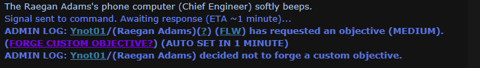 If the objective is admin-handled, admins will be notified of your request and either confirm or deny the action. You will be alerted to their action by a beep and if they confirm, the objective will be marked as complete and you will be able to redeem the objective as normal.