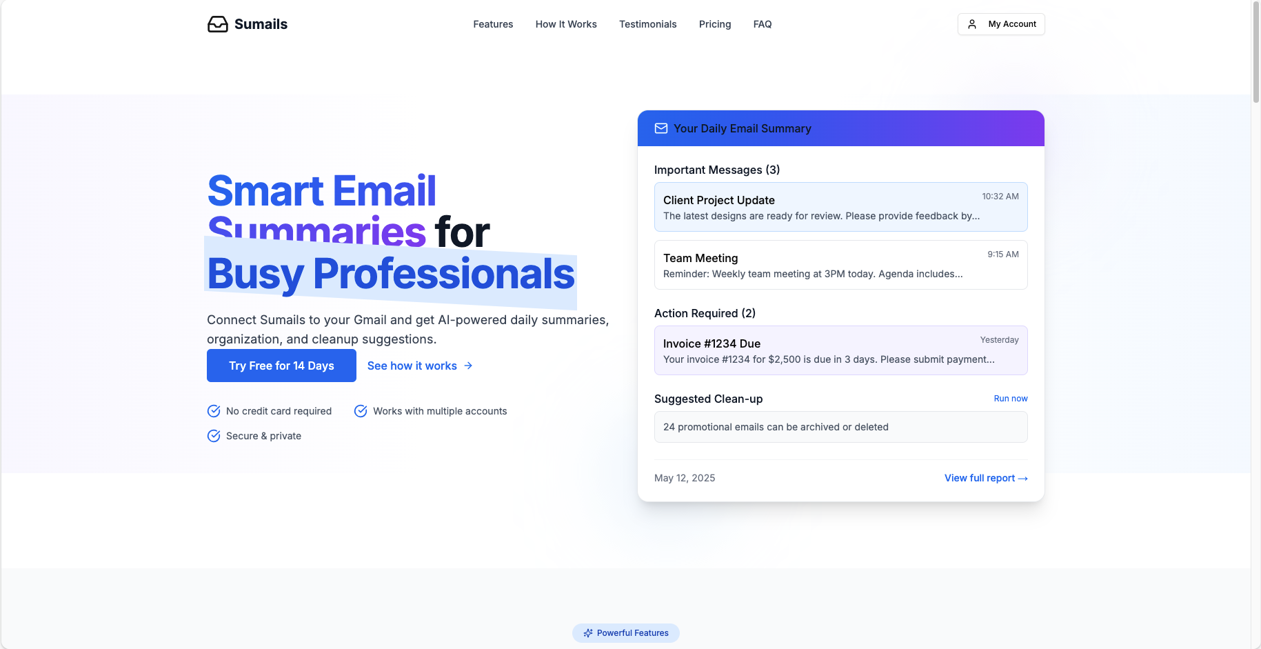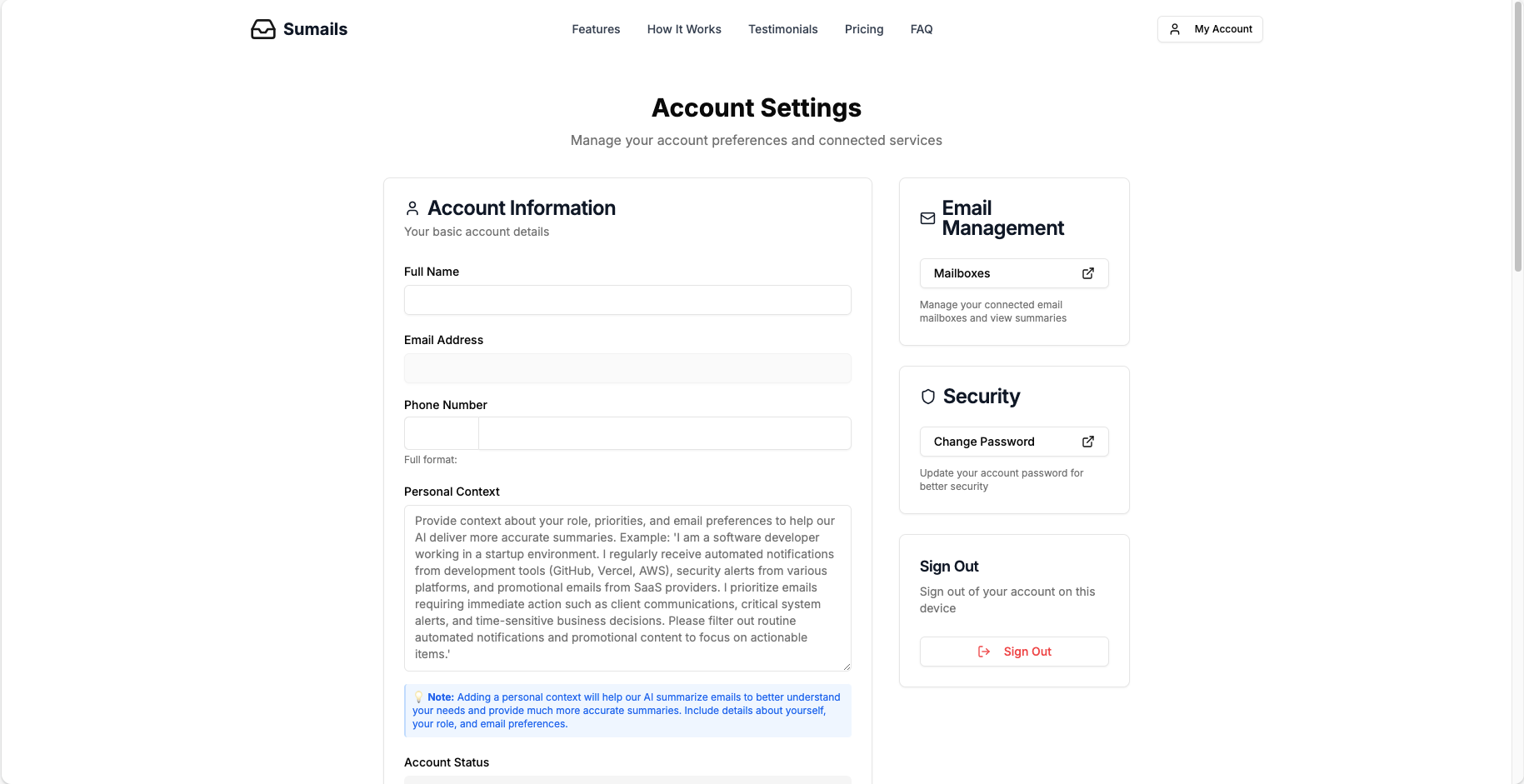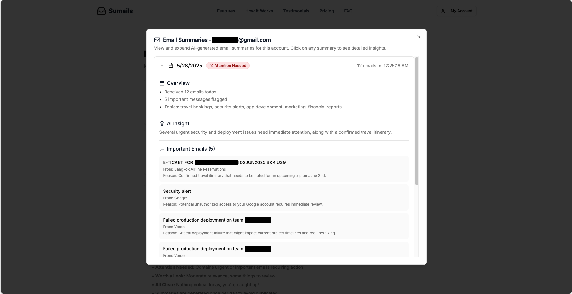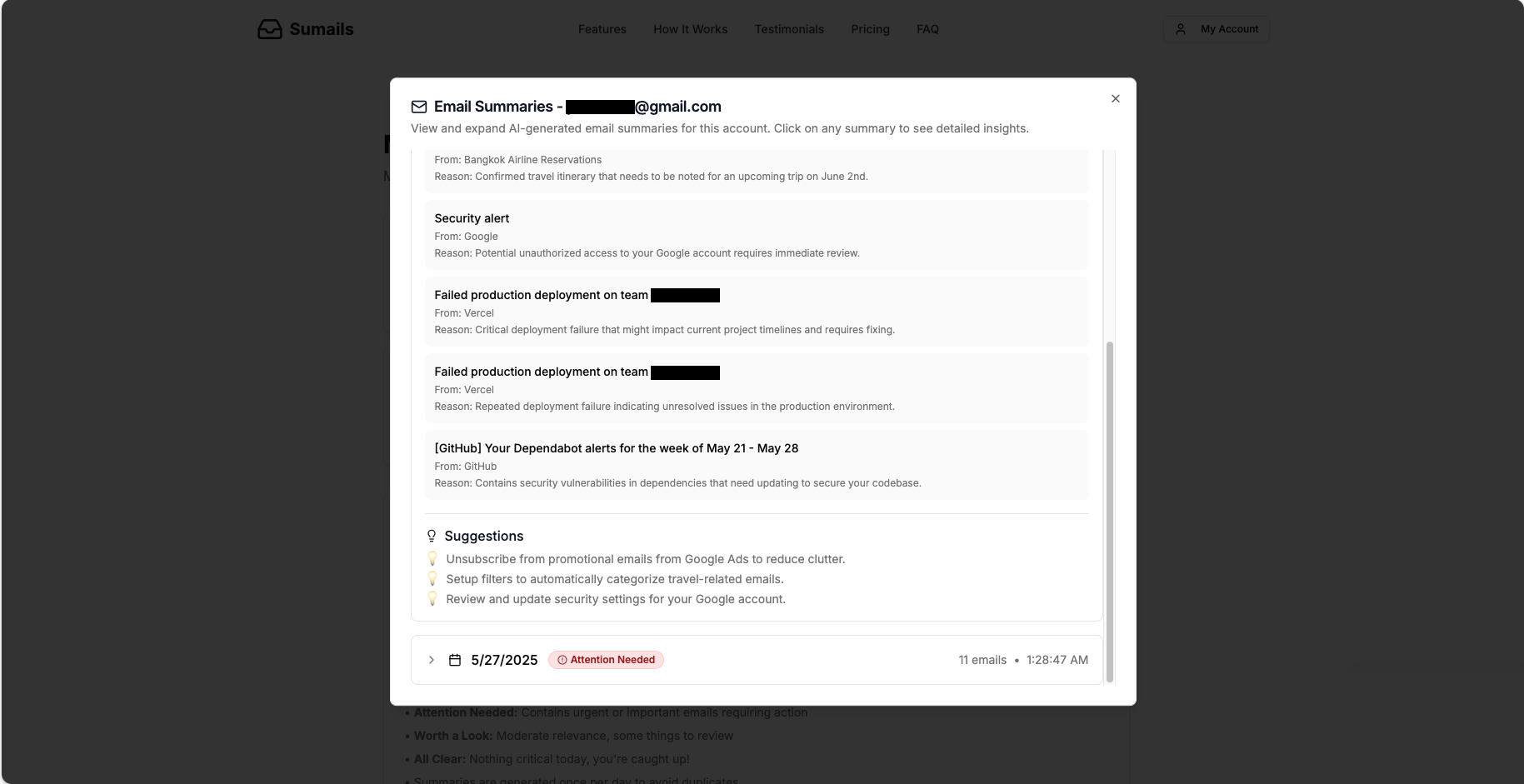 Sumails is a demo web application that I've been working on to showcase modern web development practices and AI integration. It's designed to help users manage their Gmail inboxes more effectively by providing AI-powered daily summaries, insights, and organizational tools. The application connects securely to users' Gmail accounts and uses OpenAI's GPT models to analyze email content and generate concise, actionable summaries.