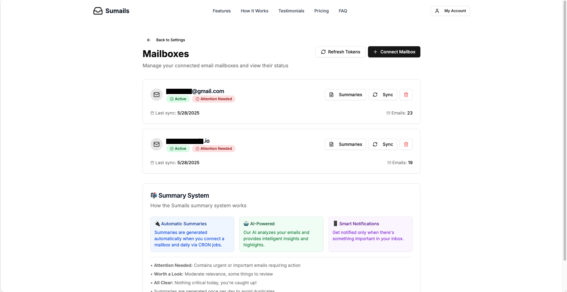 GET /api/mailboxes: Fetches all connected mailboxes for the authenticated user.POST /api/mailboxes: Initiates the OAuth flow to connect a new mailbox.POST /api/mailboxes/refresh-tokens: Refreshes OAuth tokens for all mailboxes of the authenticated user.DELETE /api/mailboxes/[id]: Disconnects a specific mailbox.POST /api/mailboxes/[id]/sync: Tests the connection to a specific mailbox by fetching a few emails.